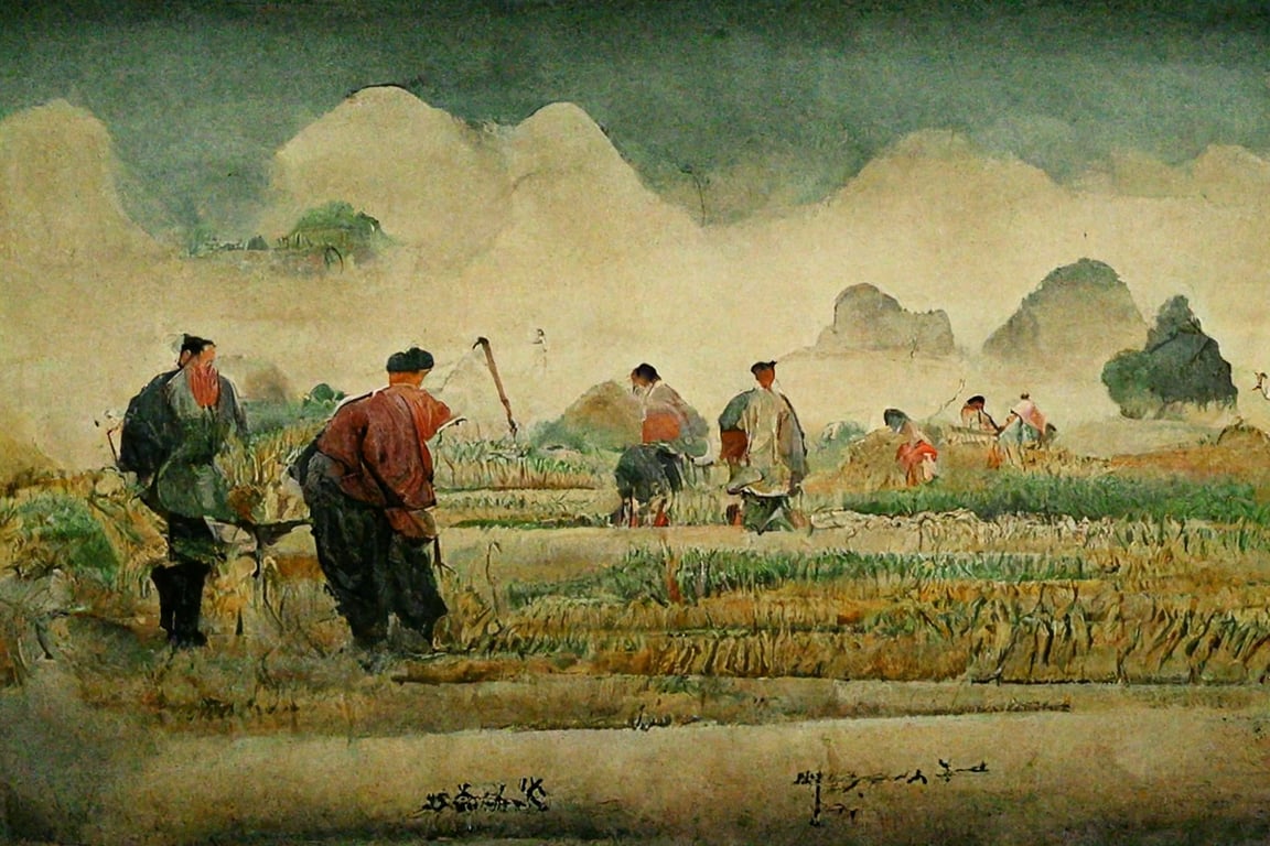prompthunt: rural agriculture traditional chinese painting, faded colour,  farmers in the fields, variety of crops